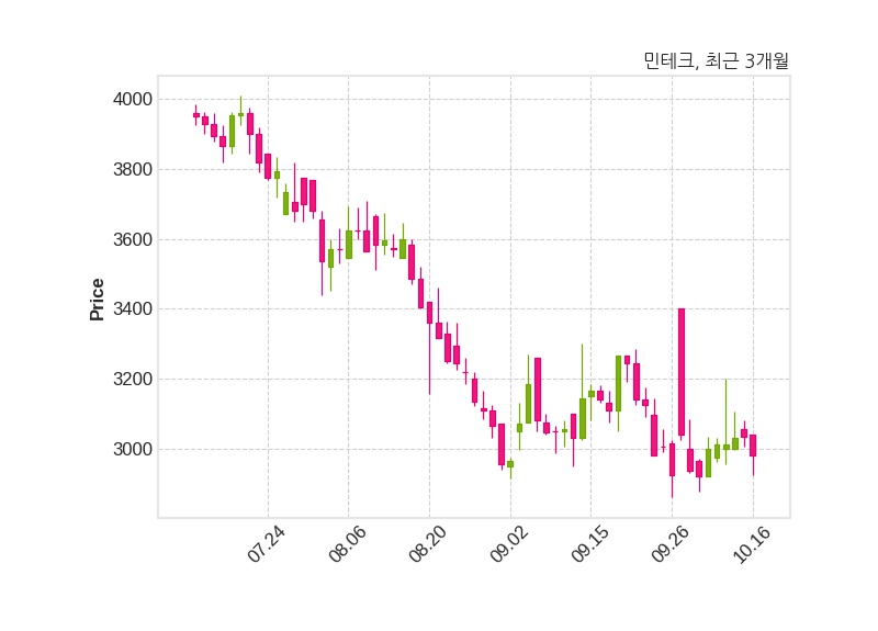 민테크는 특별관계자 LG에너지솔루션의 지분율이 4.95%에서 5.33%로 변동했다고 16일 공시했다. 한편, 민테크는 장 마감 이후 해당 기업공시를 발표했으며 오늘 종가가 2,980원, 거래량은 136,539주로, 직전 거래일 대비 55원(-1.81%) 하락했다.