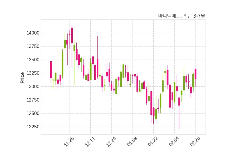 한편, 바디텍메드는 장 마감 이후 해당 기업공시를 발표했으며 오늘 종가가 13,150원, 거래량은 38,622주로, 직전 거래일 대비 80원(-0.6%) 하락했다.