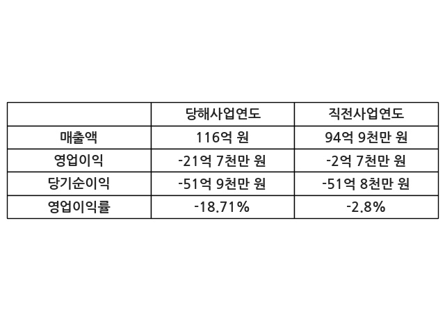 이번사업연도의 매출액은 직전사업연도 대비 22.28% 증가한 116억 원, 영업이익은 -21억 7천만 원, 당기순이익은 -51억 9천만 원이라고 공시했다.