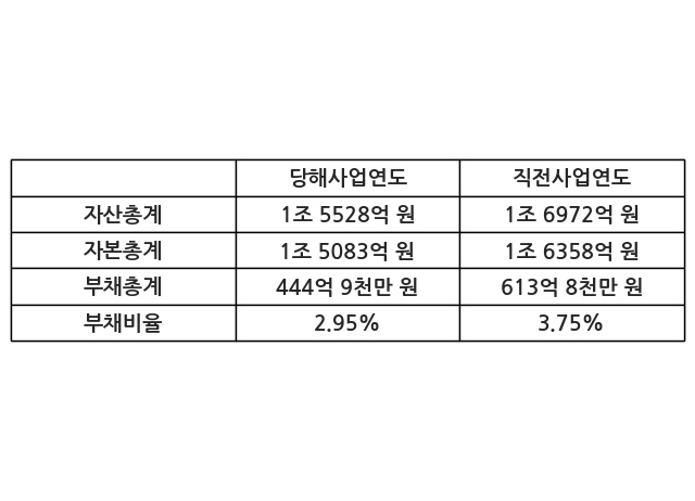 또한, 이번사업연도의 자산총계는 1조 5528억 원으로 직전사업연도 대비 -8.5% 감소한 한편, 부채총계는 444억 9천만 원으로 -27.52% 감소, 자본총계는 1조 5083억 원으로 -7.79% 감소했다.