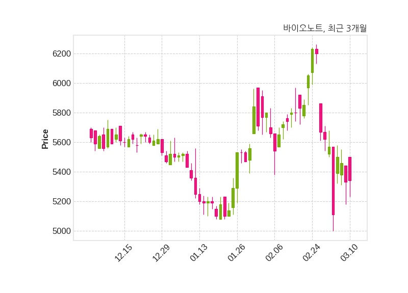 한편, 바이오노트는 장 마감 이후 해당 기업공시를 발표했으며 오늘 종가가 5,340원, 거래량은 127,388주로, 직전 거래일 대비 10원(+0.19%) 상승했다.