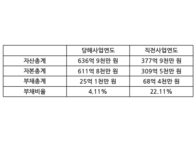 또한, 이번사업연도의 자산총계는 636억 9천만 원으로 직전사업연도 대비 68.54% 증가한 한편, 부채총계는 25억 1천만 원으로 -63.29% 감소, 자본총계는 611억 8천만 원으로 97.68% 증가했다.