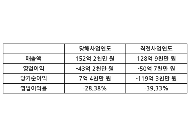 이번사업연도의 매출액은 직전사업연도 대비 18.06% 증가한 152억 2천만 원, 영업이익은 -43억 2천만 원, 당기순이익은 7억 4천만 원이라고 공시했다.