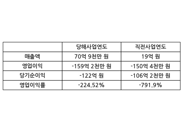 이번사업연도의 매출액은 직전사업연도 대비 273.46% 증가한 70억 9천만 원, 영업이익은 -159억 2천만 원, 당기순이익은 -122억 원이라고 공시했다.