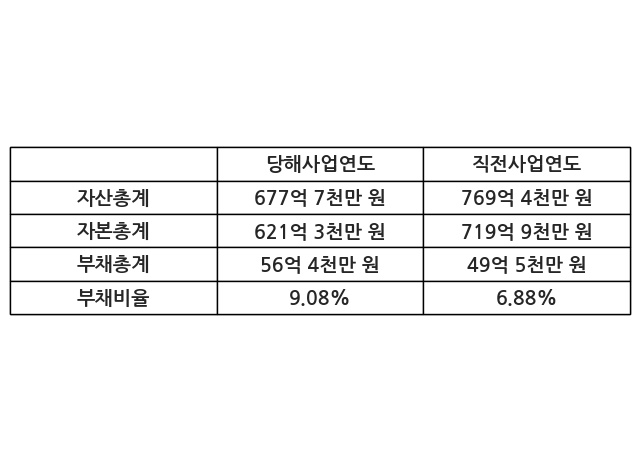 또한, 이번사업연도의 자산총계는 677억 7천만 원으로 직전사업연도 대비 -11.92% 감소한 한편, 부채총계는 56억 4천만 원으로 13.94% 증가, 자본총계는 621억 3천만 원으로 -13.7% 감소했다.
