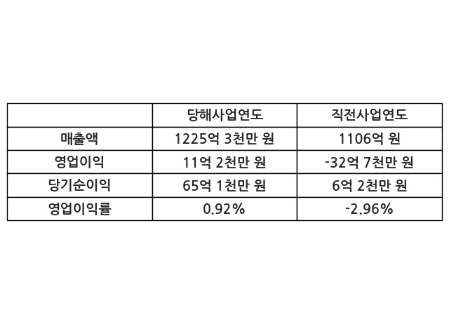이번사업연도의 매출액은 직전사업연도 대비 10.79% 증가한 1225억 3천만 원, 영업이익은 11억 2천만 원, 당기순이익은 65억 1천만 원이라고 공시했다.