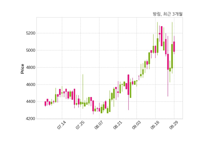 한편, 방림의 13시 09분 현재주가는 4,985원으로 직전 거래일 대비 85원(-1.68%) 하락이며, 거래량은 27,014주이다.