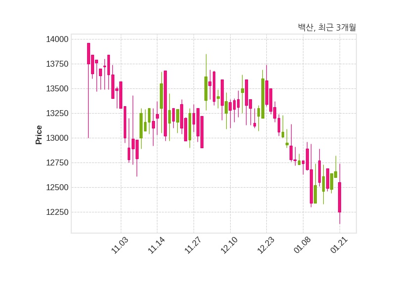 한편, 백산은 장 마감 이후 해당 기업공시를 발표했으며 오늘 종가가 12,250원, 거래량은 57,621주로, 직전 거래일 대비 410원(-3.24%) 하락했다.