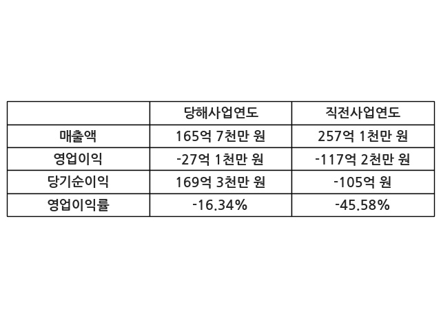 이번사업연도의 매출액은 직전사업연도 대비 -35.54% 감소한 165억 7천만 원, 영업이익은 -27억 1천만 원, 당기순이익은 169억 3천만 원이라고 공시했다.