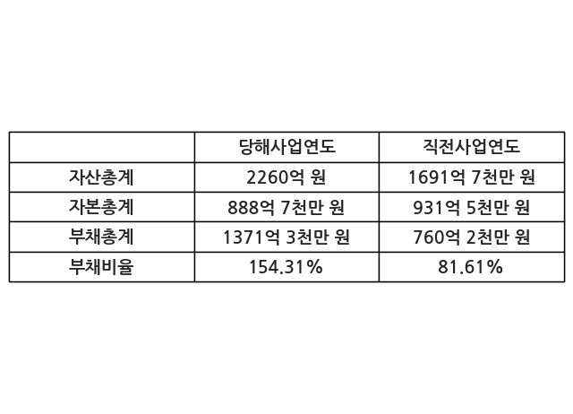 또한, 이번사업연도의 자산총계는 2260억 원으로 직전사업연도 대비 33.59% 증가한 한편, 부채총계는 1371억 3천만 원으로 80.39% 증가, 자본총계는 888억 7천만 원으로 -4.6% 감소했다.