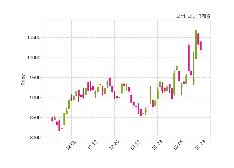한편, 보령은 장 마감 이후 해당 기업공시를 발표했으며 오늘 종가가 10,200원, 거래량은 269,044주로, 직전 거래일 대비 150원(-1.45%) 하락했다.