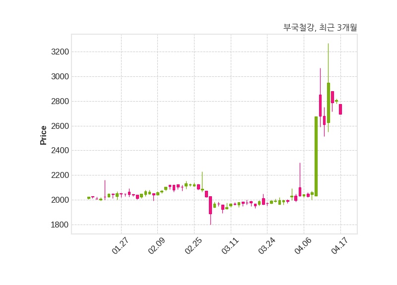 한편, 부국철강은 장 마감 이후 해당 기업공시를 발표했으며 오늘 종가가 2,695원, 거래량은 499,979주로, 직전 거래일 대비 110원(-3.92%) 하락했다.
