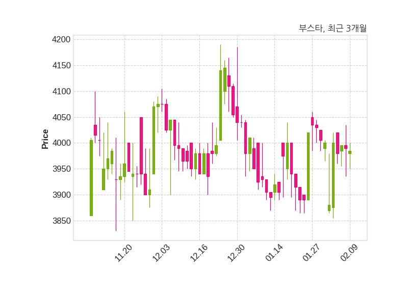한편, 부스타의 11시 51분 현재주가는 3,985원으로 직전 거래일 대비 5원(-0.13%) 하락이며, 거래량은 4,619주이다.