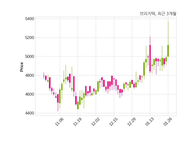 한편, 브리지텍의 11시 58분 현재주가는 5,120원으로 직전 거래일 대비 130원(+2.61%) 상승이며, 거래량은 104,456주이다.