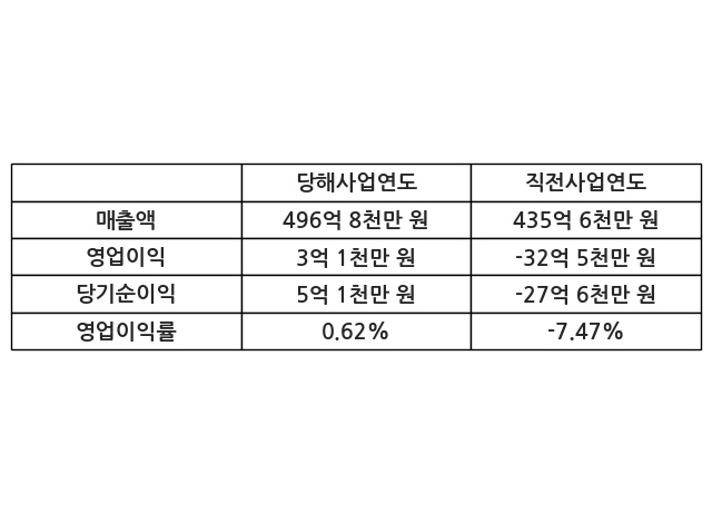 이번사업연도의 매출액은 직전사업연도 대비 14.04% 증가한 496억 8천만 원, 영업이익은 3억 1천만 원, 당기순이익은 5억 1천만 원이라고 공시했다.