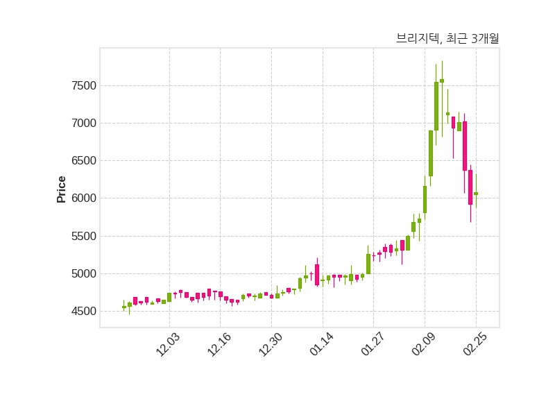 한편, 브리지텍은 장 마감 이후 해당 기업공시를 발표했으며 오늘 종가가 6,080원, 거래량은 391,590주로, 직전 거래일 대비 160원(+2.7%) 상승했다.