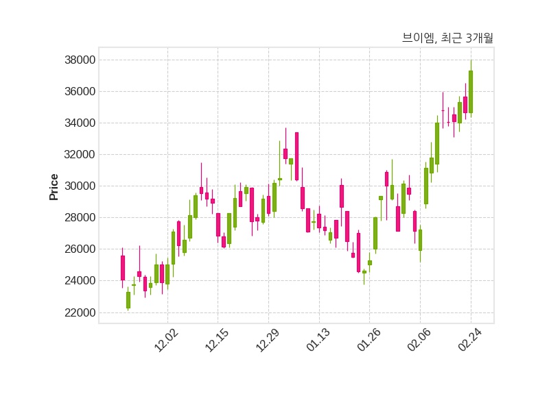 한편, 브이엠의 11시 04분 현재주가는 37,300원으로 직전 거래일 대비 2,650원(+7.65%) 상승이며, 거래량은 307,008주이다.