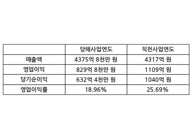 이번사업연도의 매출액은 직전사업연도 대비 1.36% 증가한 4375억 8천만 원, 영업이익은 829억 8천만 원, 당기순이익은 632억 4천만 원이라고 공시했다.