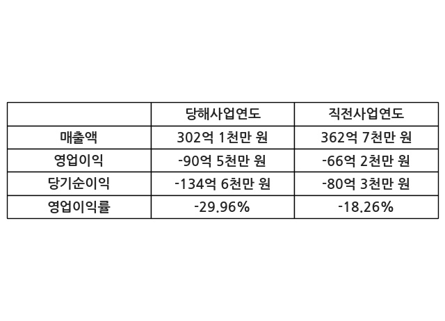 이번사업연도의 매출액은 직전사업연도 대비 -16.71% 감소한 302억 1천만 원, 영업이익은 -90억 5천만 원, 당기순이익은 -134억 6천만 원이라고 공시했다.