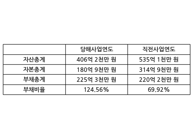 또한, 이번사업연도의 자산총계는 406억 2천만 원으로 직전사업연도 대비 -24.09% 감소한 한편, 부채총계는 225억 3천만 원으로 2.33% 증가, 자본총계는 180억 9천만 원으로 -42.56% 감소했다.