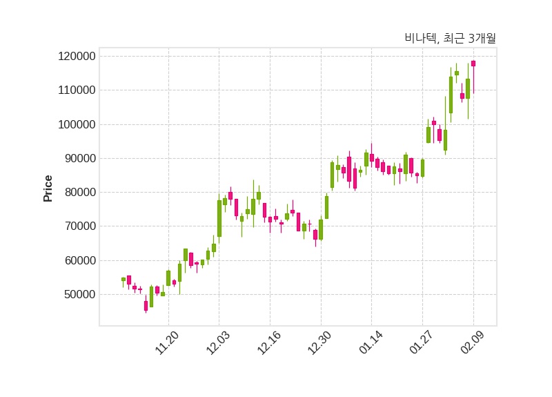 한편, 비나텍은 장 마감 이후 해당 기업공시를 발표했으며 오늘 종가가 117,200원, 거래량은 115,213주로, 직전 거래일 대비 3,900원(+3.44%) 상승했다.