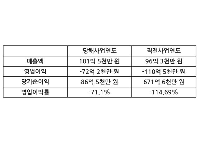 이번사업연도의 매출액은 직전사업연도 대비 5.34% 증가한 101억 5천만 원, 영업이익은 -72억 2천만 원, 당기순이익은 86억 5천만 원이라고 공시했다.