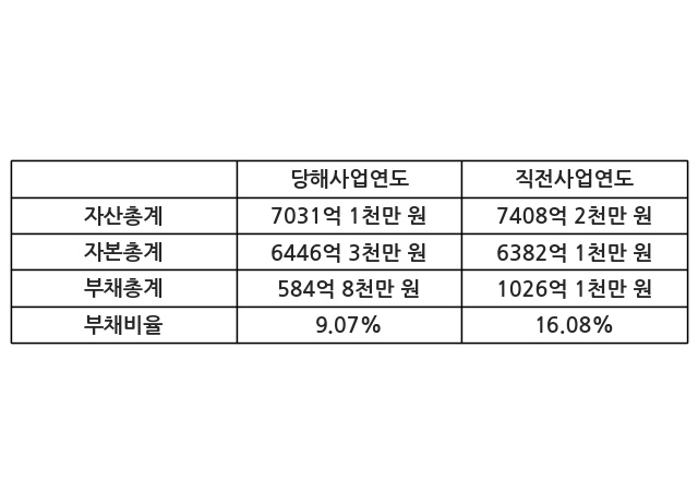 또한, 이번사업연도의 자산총계는 7031억 1천만 원으로 직전사업연도 대비 -5.09% 감소한 한편, 부채총계는 584억 8천만 원으로 -43.0% 감소, 자본총계는 6446억 3천만 원으로 1.01% 증가했다.