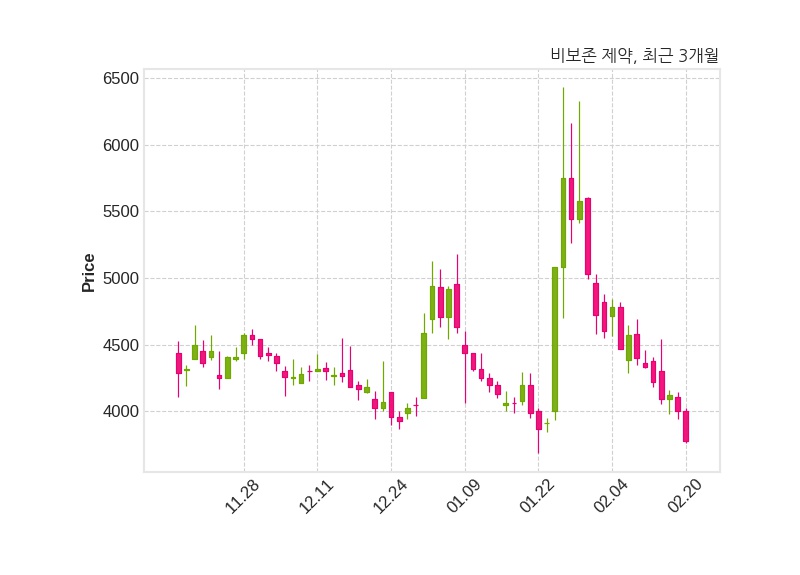 한편, 비보존 제약은 장 마감 이후 해당 기업공시를 발표했으며 오늘 종가가 3,780원, 거래량은 862,482주로, 직전 거래일 대비 225원(-5.62%) 하락했다.