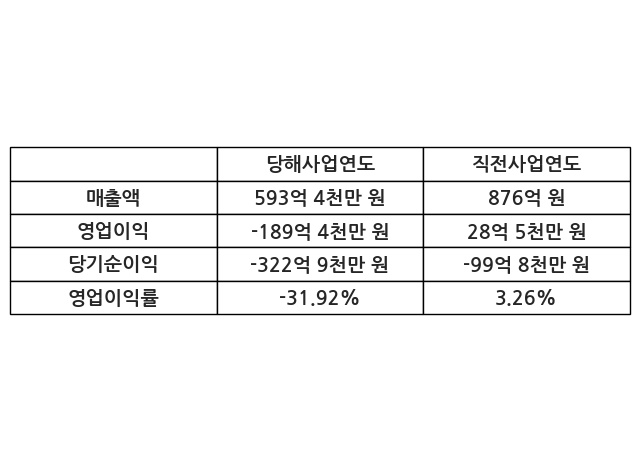 이번사업연도의 매출액은 직전사업연도 대비 -32.26% 감소한 593억 4천만 원, 영업이익은 -189억 4천만 원, 당기순이익은 -322억 9천만 원이라고 공시했다.