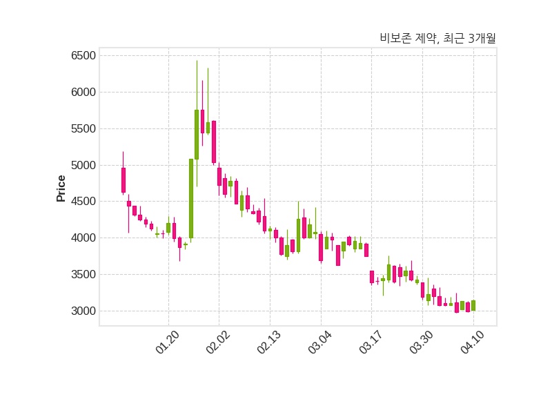 한편, 비보존 제약은 장 마감 이후 해당 기업공시를 발표했으며 오늘 종가가 3,145원, 거래량은 218,210주로, 직전 거래일 대비 150원(+5.01%) 상승했다.