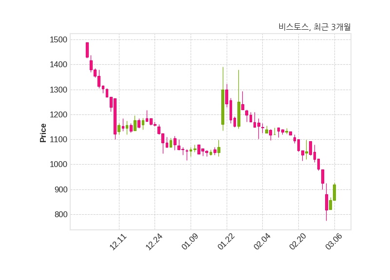한편, 비스토스는 장 마감 이후 해당 기업공시를 발표했으며 오늘 종가가 918원, 거래량은 145,697주로, 직전 거래일 대비 62원(+7.24%) 상승했다.