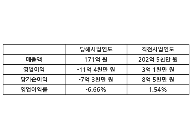 이번사업연도의 매출액은 직전사업연도 대비 -15.58% 감소한 171억 원, 영업이익은 -11억 4천만 원, 당기순이익은 -7억 3천만 원이라고 공시했다.