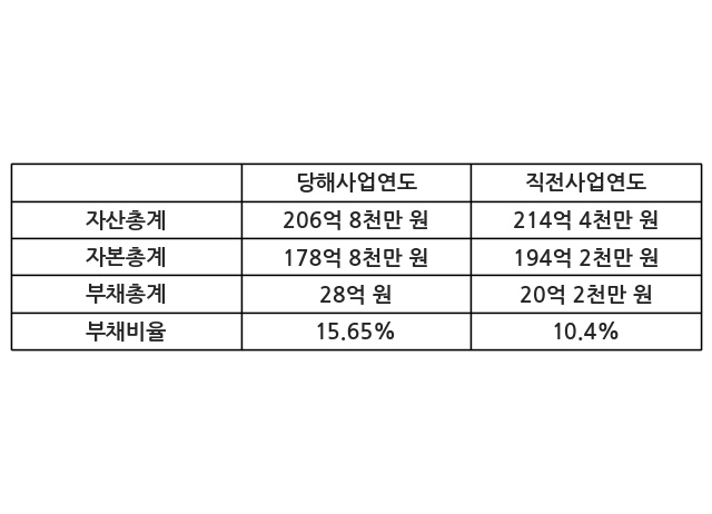 또한, 이번사업연도의 자산총계는 206억 8천만 원으로 직전사업연도 대비 -3.53% 감소한 한편, 부채총계는 28억 원으로 38.54% 증가, 자본총계는 178억 8천만 원으로 -7.9% 감소했다.