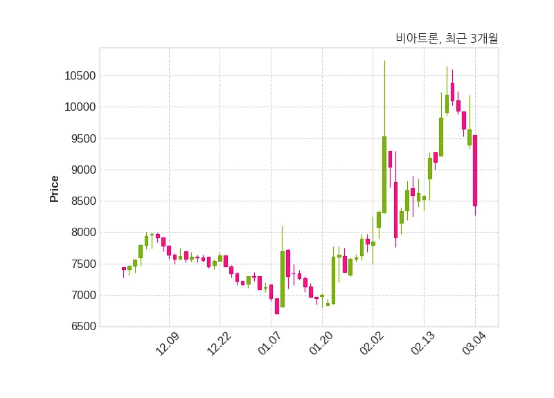 한편, 비아트론의 14시 42분 현재주가는 8,420원으로 직전 거래일 대비 1,220원(-12.66%) 하락이며, 거래량은 202,725주이다.