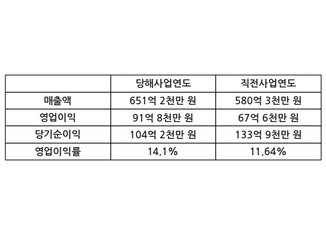 이번사업연도의 매출액은 직전사업연도 대비 12.21% 증가한 651억 2천만 원, 영업이익은 91억 8천만 원, 당기순이익은 104억 2천만 원이라고 공시했다.
