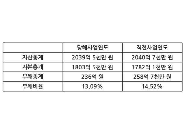 또한, 이번사업연도의 자산총계는 2039억 5천만 원으로 직전사업연도 대비 -0.06% 감소한 한편, 부채총계는 236억 원으로 -8.77% 감소, 자본총계는 1803억 5천만 원으로 1.2% 증가했다.