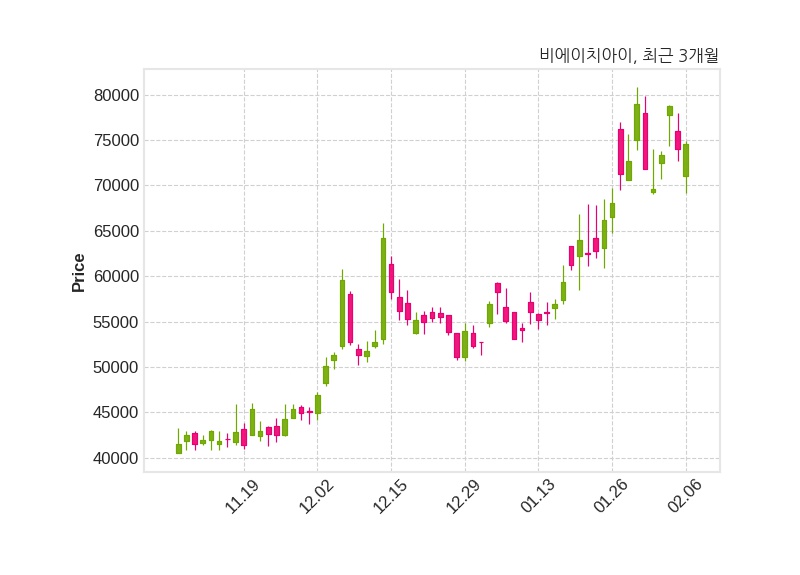 한편, 비에이치아이의 09시 58분 현재주가는 74,600원으로 직전 거래일 대비 600원(+0.81%) 상승이며, 거래량은 143,500주이다.