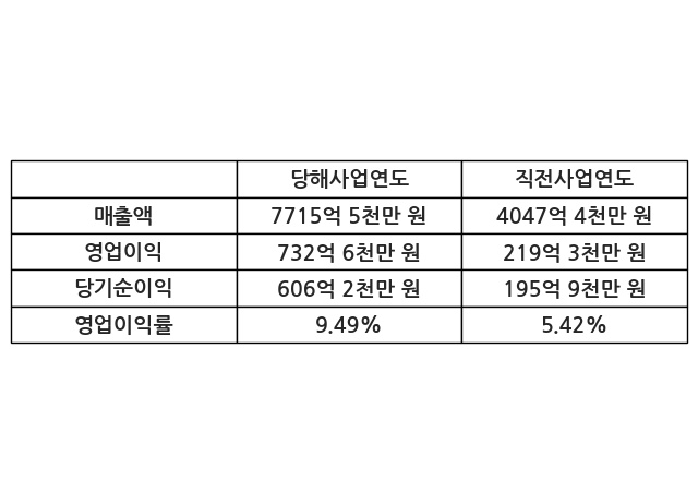 이번사업연도의 매출액은 직전사업연도 대비 90.63% 증가한 7715억 5천만 원, 영업이익은 732억 6천만 원, 당기순이익은 606억 2천만 원이라고 공시했다.