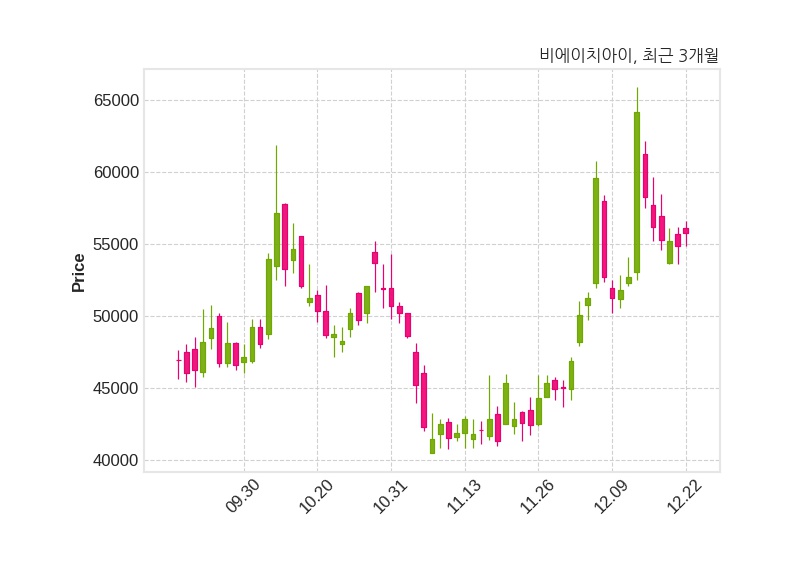 한편, 비에이치아이의 11시 17분 현재주가는 55,800원으로 직전 거래일 대비 900원(+1.64%) 상승이며, 거래량은 594,957주이다.