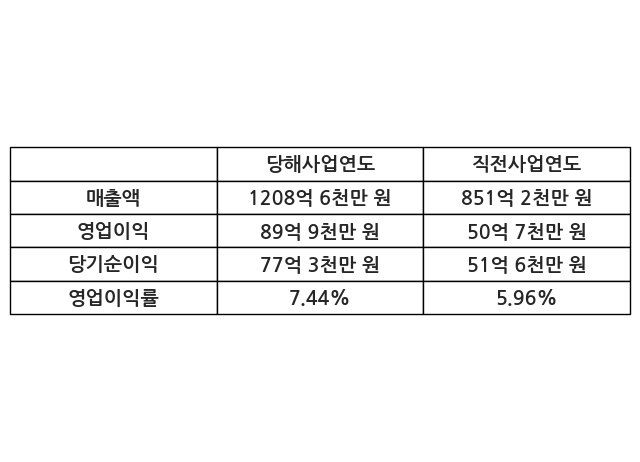 이번사업연도의 매출액은 직전사업연도 대비 41.98% 증가한 1208억 6천만 원, 영업이익은 89억 9천만 원, 당기순이익은 77억 3천만 원이라고 공시했다.