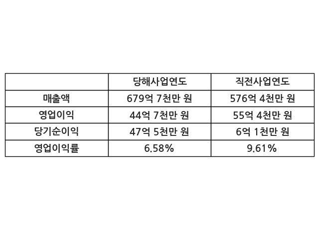 이번사업연도의 매출액은 직전사업연도 대비 17.92% 증가한 679억 7천만 원, 영업이익은 44억 7천만 원, 당기순이익은 47억 5천만 원이라고 공시했다.