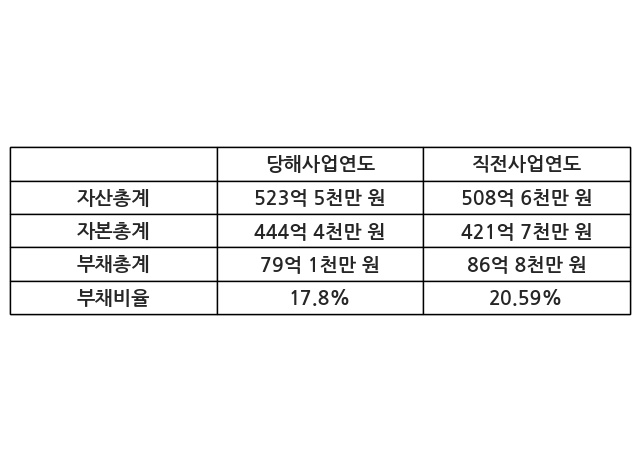 또한, 이번사업연도의 자산총계는 523억 5천만 원으로 직전사업연도 대비 2.94% 증가한 한편, 부채총계는 79억 1천만 원으로 -8.91% 감소, 자본총계는 444억 4천만 원으로 5.38% 증가했다.