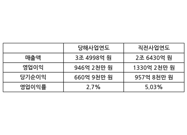 이번사업연도의 매출액은 직전사업연도 대비 32.42% 증가한 3조 4998억 원, 영업이익은 946억 2천만 원, 당기순이익은 660억 9천만 원이라고 공시했다.