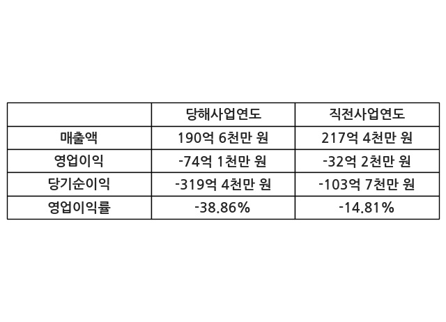 이번사업연도의 매출액은 직전사업연도 대비 -12.35% 감소한 190억 6천만 원, 영업이익은 -74억 1천만 원, 당기순이익은 -319억 4천만 원이라고 공시했다.