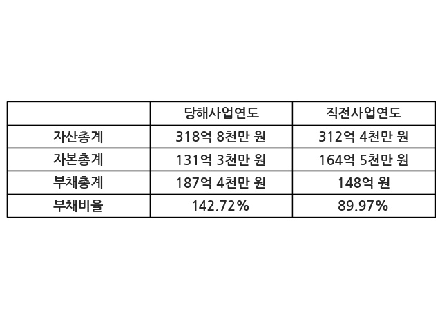 또한, 이번사업연도의 자산총계는 318억 8천만 원으로 직전사업연도 대비 2.04% 증가한 한편, 부채총계는 187억 4천만 원으로 26.69% 증가, 자본총계는 131억 3천만 원으로 -20.14% 감소했다.
