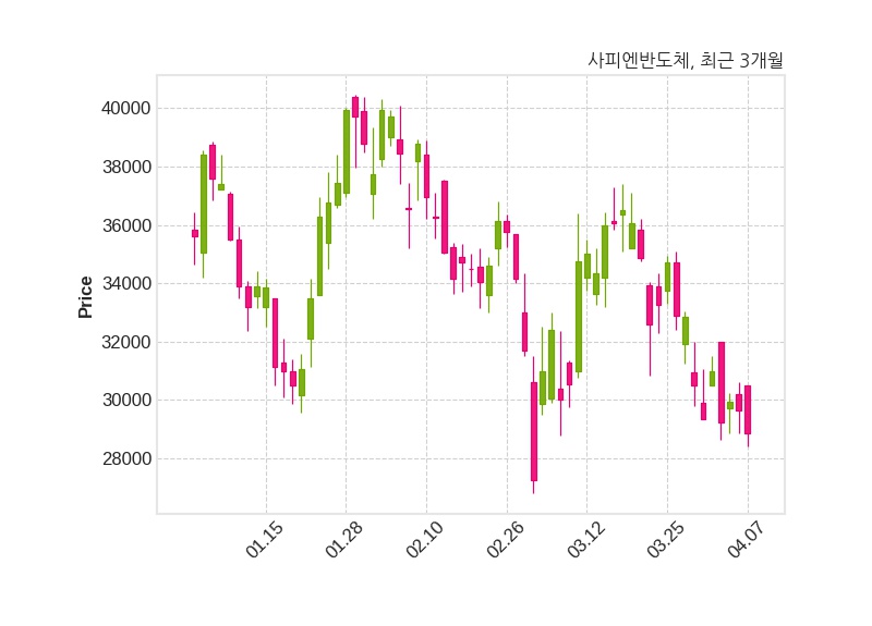 한편, 사피엔반도체는 장 마감 이후 해당 기업공시를 발표했으며 오늘 종가가 28,850원, 거래량은 28,481주로, 직전 거래일 대비 800원(-2.7%) 하락했다.
