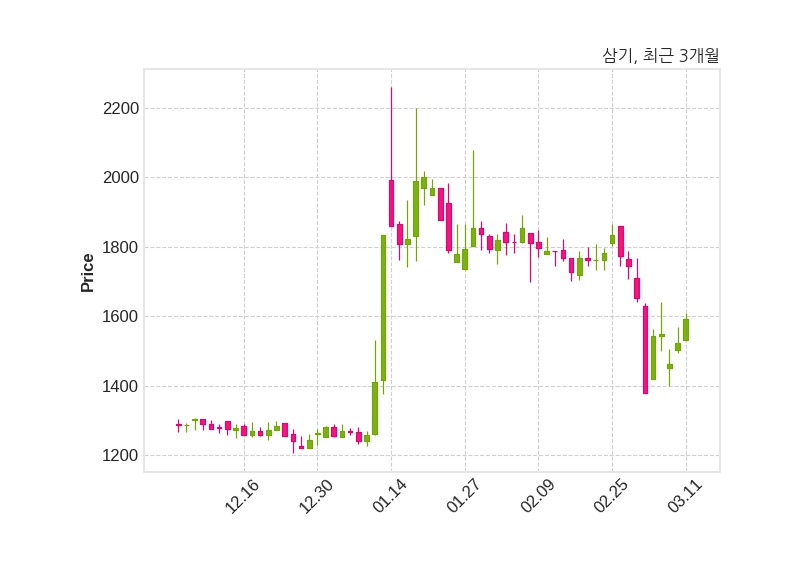 한편, 삼기의 13시 55분 현재주가는 1,593원으로 직전 거래일 대비 69원(+4.53%) 상승이며, 거래량은 166,804주이다.