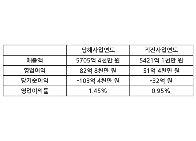 이번사업연도의 매출액은 직전사업연도 대비 5.24% 증가한 5705억 4천만 원, 영업이익은 82억 8천만 원, 당기순이익은 -103억 4천만 원이라고 공시했다.
