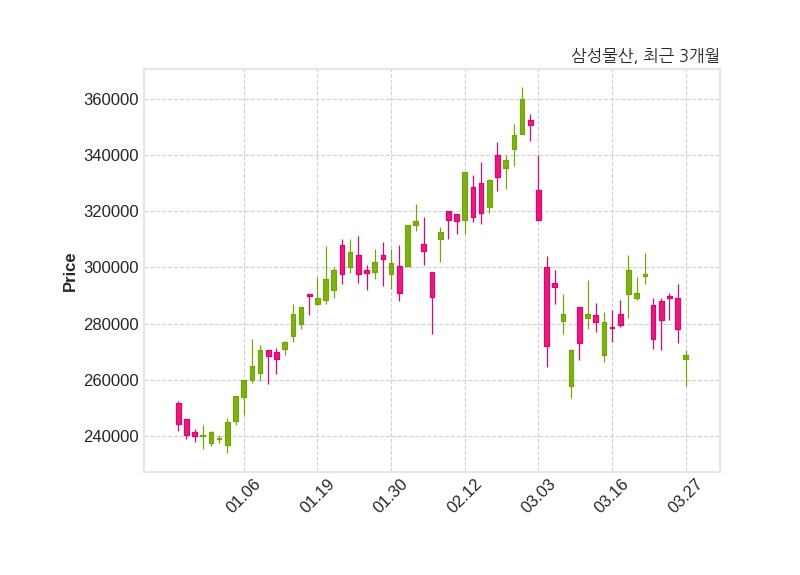 한편, 삼성물산은 장 마감 이후 해당 기업공시를 발표했으며 오늘 종가가 269,000원, 거래량은 683,519주로, 직전 거래일 대비 9,000원(-3.24%) 하락했다.