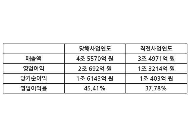이번사업연도의 매출액은 직전사업연도 대비 30.31% 증가한 4조 5570억 원, 영업이익은 2조 692억 원, 당기순이익은 1조 6143억 원이라고 공시했다.